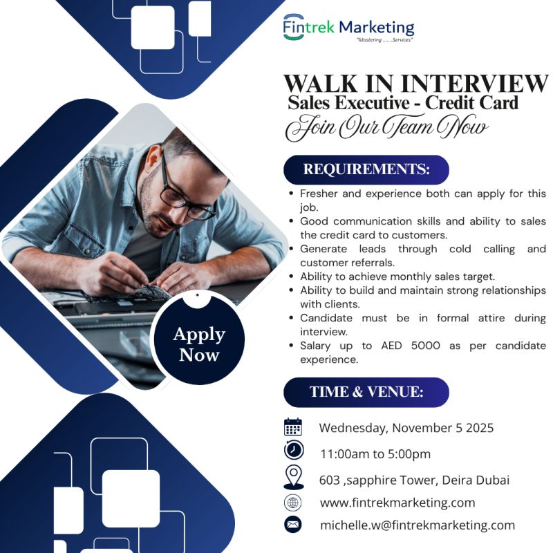 Fintrek Marketing, a dynamic and growing company in the financial services sector, is hosting a Fintrek Marketing Walk in Interview in Dubai. With a commitment to excellence and a dynamic team, Fintrek Marketing offers an exciting work environment where employees can thrive and grow professionally ๐ข.