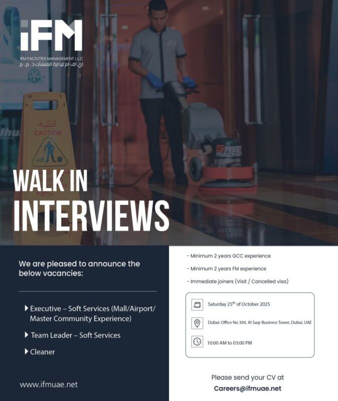 Interested candidates can attend the iFM Walk in Interview in Dubai at the specified location and dates. Attend on the specified date with your updated CV and seize your chance to join a dynamic team. This is your opportunity to advance your career with a leading company in a professional and growth-oriented environment. Kindly send your CV at [email protected].