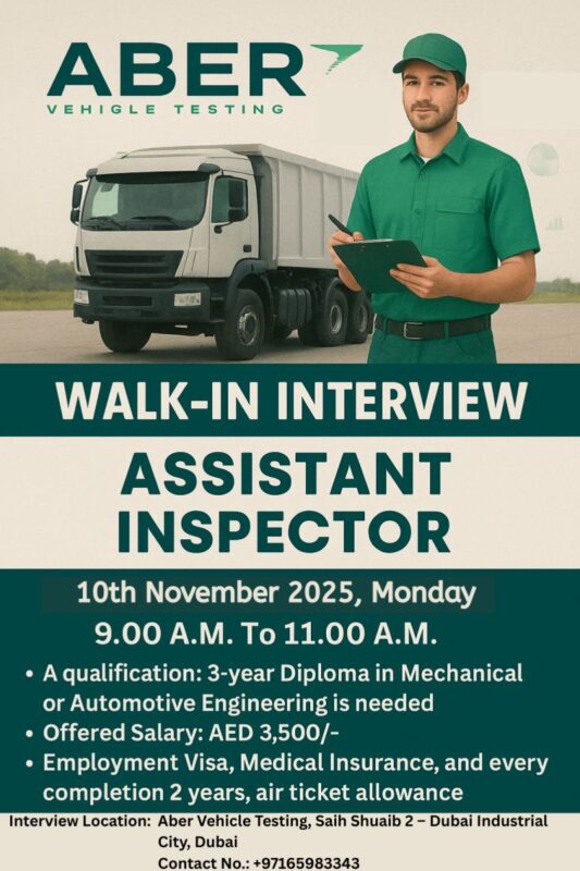 Aber Vehicle Testing, a reputable name in vehicle inspection and certification services in the UAE, has announced a walk-in interview in Dubai for candidates seeking a stable and rewarding career in the automotive inspection sector. Known for its high standards of quality, professionalism, and safety, Aber Vehicle Testing provides exceptional opportunities for technically skilled individuals eager to contribute to Dubai’s growing automotive industry.