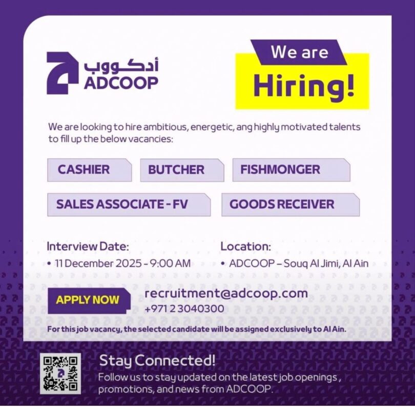 ADCOOP aims to onboard talented candidates who are passionate about retail, customer service, and operational excellence. According to the announcement, selected candidates will be assigned exclusively to Al Ain, making this an ideal opportunity for those based in the region or looking to relocate.