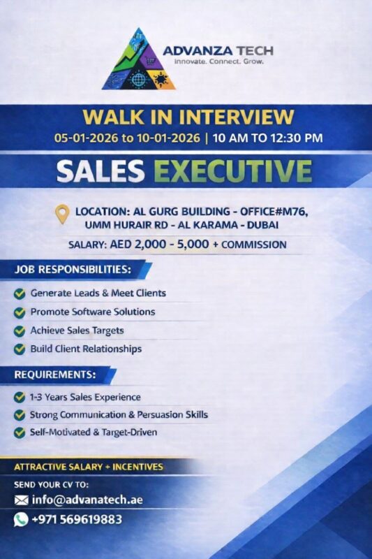 A growing technology-driven company, has announced Advanza Tech Walk in Interviews in Dubai for motivated sales professionals. The hiring drive is part of the company’s expansion strategy and aims to attract talented individuals who are passionate about sales, technology, and client engagement 📢.