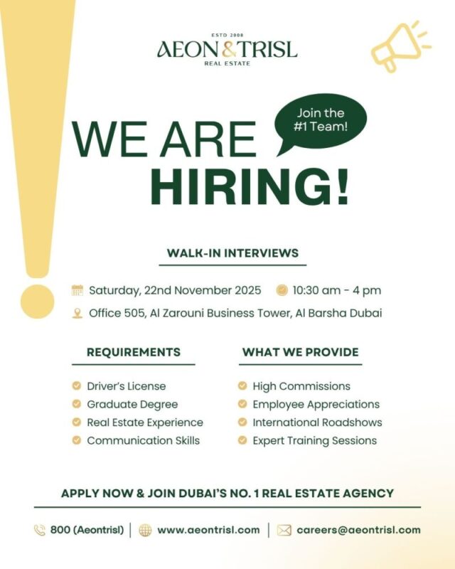 Aeon & Trisl Real Estate Brokers, a leading name in Dubai’s dynamic real estate market, is conducting Aeon & Trisl Walk in Interview in Dubai on this Saturday. This is an exceptional opportunity for driven professionals looking to advance their careers in one of the most competitive real estate environments in the world ๐ข.