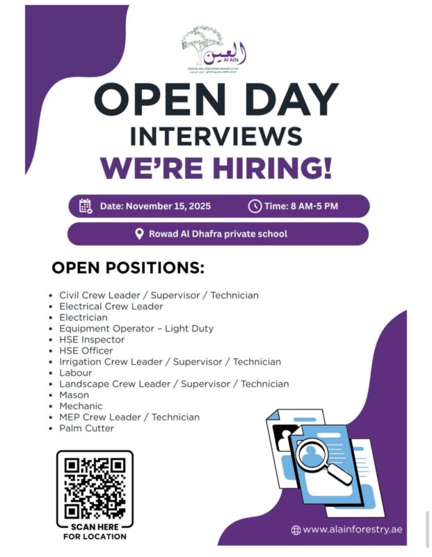 Al Ain Forestry & Landscaping Services, a leading name in the UAE’s landscaping and environmental management sector, has announced Al Ain Forestry Open Day Recruitment in Abu Dhabi for multiple vacancies. The recruitment drive will be held on Saturday, November 15th, 2025 📢.