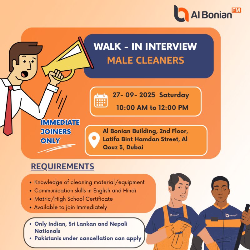 A leading facilities management company in the Dubai, is conducting a Al Bonian FM Walk in Interview. This presents an excellent opportunity for qualified candidates to join a dynamic team dedicated to excellence in facilities management π’.