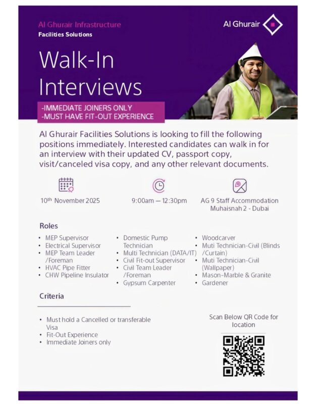 Al Ghurair Facilities Solutions, a reputed name in the UAEβs facilities management and fit-out industry, has announced Al Ghurair Facilities Solutions Walk in Interviews in Dubai for multiple technical and supervisory positions. The company is seeking immediate joiners with strong fit-out experience to join their expanding team in Dubai π’.