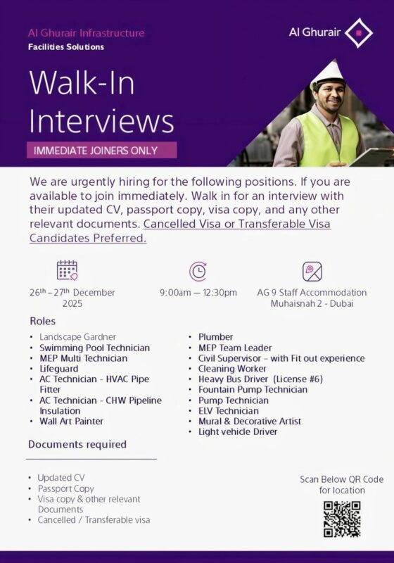 Al Ghurair Facilities Solutions Walk in Interviews in Dubai presents a great opportunity for skilled technicians and supervisors looking to advance their careers with a leading facilities management company in the UAE. Eligible candidates are encouraged to attend the walk-in interview on 26th & 27th December 2025 and take the first step toward joining Al Ghurairβs professional team.