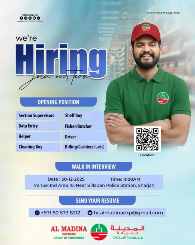 Al Madina Express Group of Companies is a well-established name in the UAE’s retail and service sector, known for operating supermarkets and related businesses that cater to diverse customer needs. Al Madina Express Group Walk in Interview in Sharjah initiative is aimed at hiring candidates for multiple operational and administrative roles 📢.
