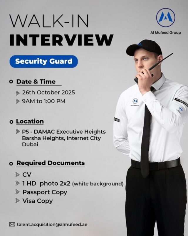Al Mufeed Group Walk in Interview offers a valuable opportunity for qualified security professionals to join a reputable company in Dubai. Candidates who meet the qualifications and are interested in the position should attend the interviews on the specified dates. This is a chance to become part of a dedicated team providing essential security services in Dubai.