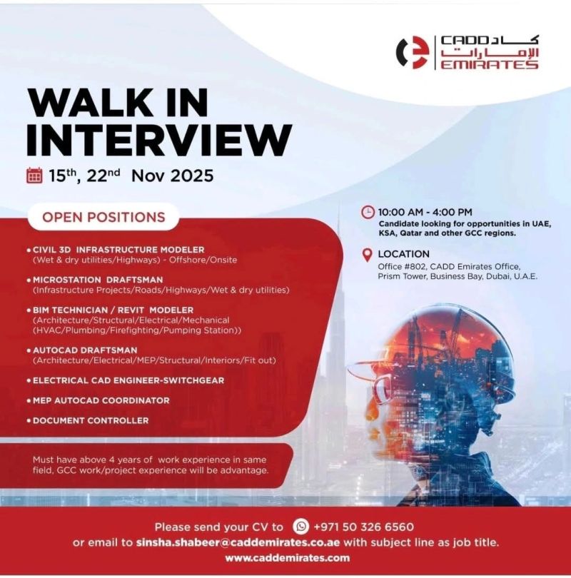 Interested applicants should bring a hard copy of their updated CV to the CADD Emirates Walk in Interview in Dubai. Interested professionals can send their CVs via WhatsApp to +971 50 326 6560 or email [email protected] with the job title mentioned in the subject line.
