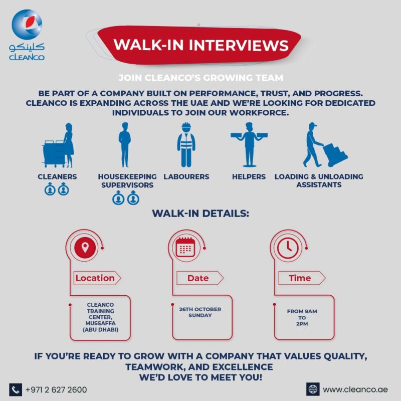 Cleanco Facilities Walk in Interview in Abu Dhabi presents a valuable opportunity to secure a role with one of the UAEβs leading facilities management companies. Don’t miss the chance to showcase your expertise and take your career to new heights with Cleanco Facilities Management Services. For any inquiries regarding the walk in interview, candidates can reach out to Cleanco at +971 26272600.