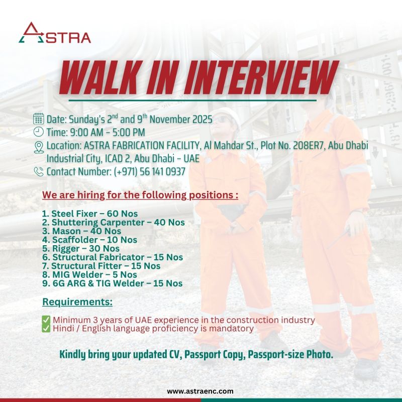 Are you seeking a new career opportunity in the Oil & Gas sector? ASTRA Engineering & Construction is hosting ASTRA Engineering Walk in Interview in Abu Dhabi for skilled professionals. This is an excellent opportunity to join an industry leader π’.