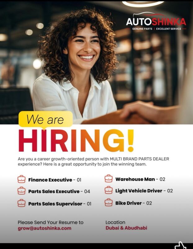 Autoshinka, a well-established name in the automotive spare parts industry, has opened doors for new talent through Autoshinka Recruitment across Dubai and Abu Dhabi. Known for its commitment to genuine parts and excellent service, the company is seeking dynamic, growth-oriented professionals with experience in multi-brand parts dealerships. This hiring initiative highlights Autoshinka’s continued expansion and its dedication to strengthening its operational and customer service capabilities 📢.