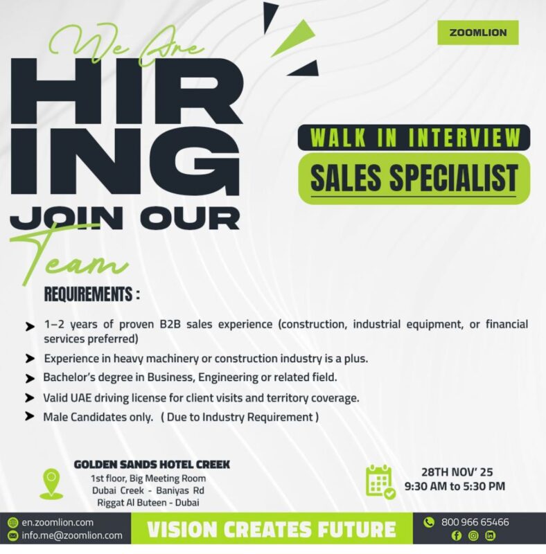 The Sales Specialist position offers a promising opportunity for individuals with a background in business development and industrial sales. The role focuses on B2B interactions, client acquisition, equipment promotion, and strengthening Zoomlion’s market presence across the UAE.