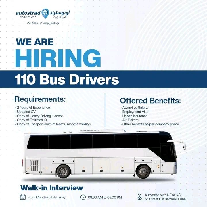 This Autostrad Walk in Interview presents a promising opportunity for qualified Bus Drivers to join Autostrad Rent a Car’s team in Dubai. Prepare your documents and attend the interview to seize this chance for employment with a leading car rental company in the UAE.