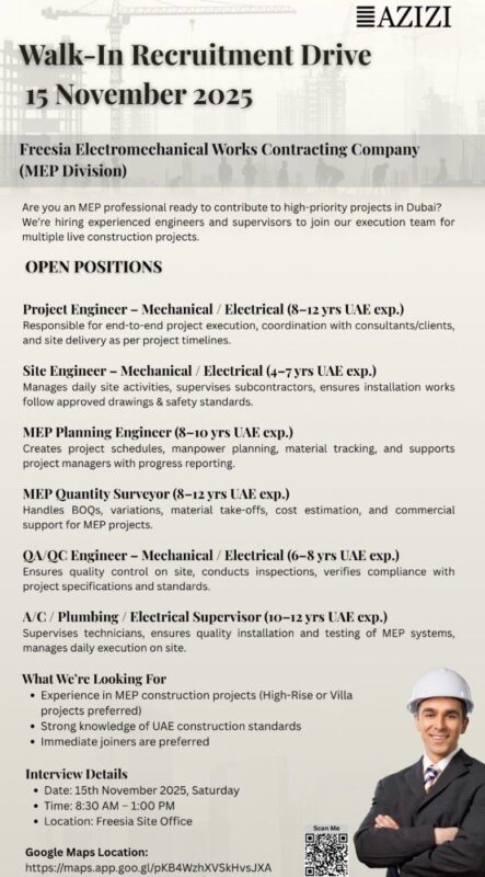 Interested candidates should attend the Azizi Developments Walk in Interview in Dubai at the specified date and time. This recruitment drive is an excellent chance for skilled professionals to advance their careers with Azizi Developments, contributing to prestigious real estate projects across Dubai. Don’t miss this opportunity to join a leader in the UAE’s construction industry.