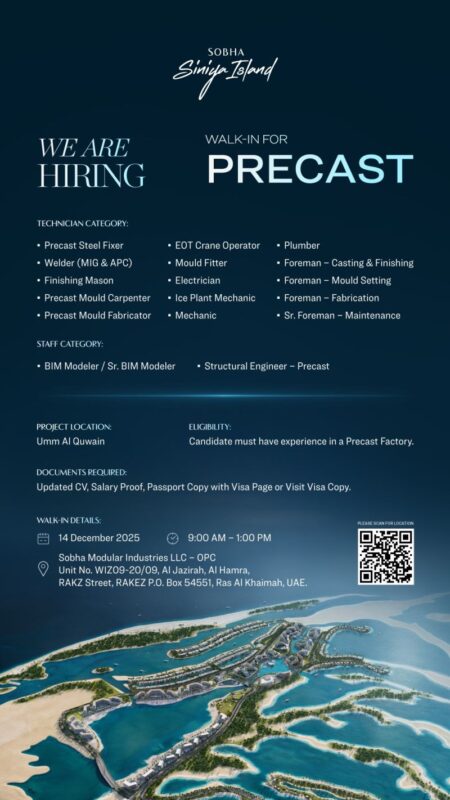 Sobha Al Siniya Walk in Interview in RAK presents a valuable opportunity for skilled professionals in the construction industry to join a prestigious company. If you meet the experience requirements and are looking for your next career move, donβt miss the chance to attend the Sobha Al Siniya Walk in Interview in Dubai on 14th December 2025.