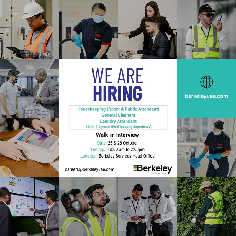 Berkeley Services Group, a leading provider of facilities management and housekeeping services, is hosting Berkeley Walk in Interview in Dubai for multiple roles within their team. This recruitment event offers a significant opportunity for candidates with hotel industry experience to join a respected company in the sector ๐ข.
