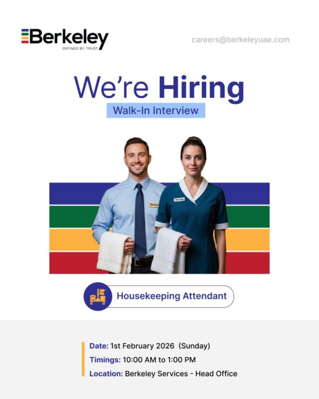 Berkeley Services Group, a leading provider of facilities management and housekeeping services, is hosting Berkeley Walk in Interview in Dubai for multiple roles within their team. This recruitment event offers a significant opportunity for candidates with hotel industry experience to join a respected company in the sector ๐ข.