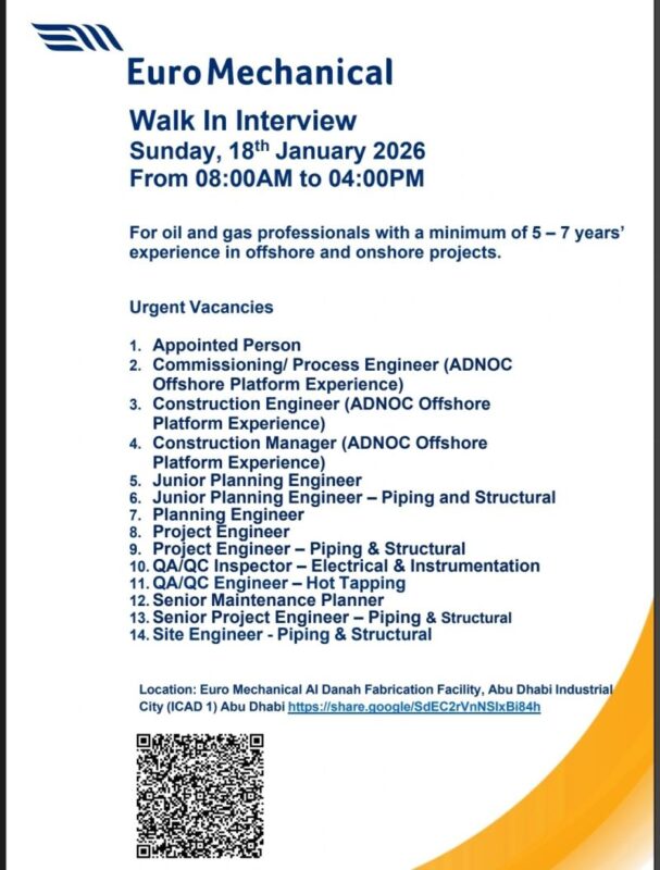 Euro Mechanical is conducting a walk in interview for experienced Oil & Gas professionals with 5β7 years of offshore/onshore project experience. Candidates with ADNOC Offshore Platform experience are highly preferred.