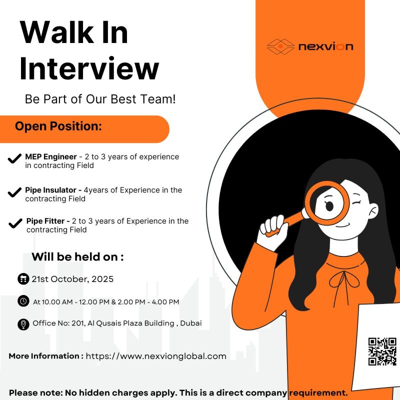 Nexvion, a leading name in engineering and technical services, has officially announced Nexvion Walk in Interview in Dubai. The company is offering a wide range of job opportunities for skilled professionals across multiple trades. This hiring drive aims to strengthen their workforce with qualified candidates who can contribute to ongoing and upcoming projects π’.