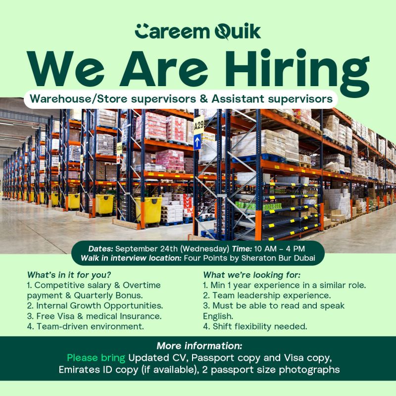 Careem Quik, one of the regionโs leading rapid delivery and logistics platforms, has announced an exciting hiring opportunity for professionals in warehouse and store management. The company is conducting Careem Walk in Interview in Dubai to recruit Warehouse/Store Supervisors and Assistant Supervisors ๐ข.