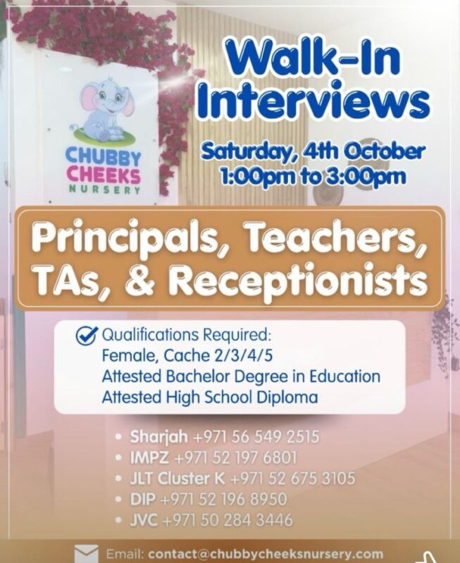 Chubby Cheeks Nursery, a reputable and well-established nursery, is conducting Chubby Cheeks Nursery Walk in Interview for several vacancies at its various branches in UAE. The nursery is known for its nurturing environment and commitment to early childhood education ๐ข.