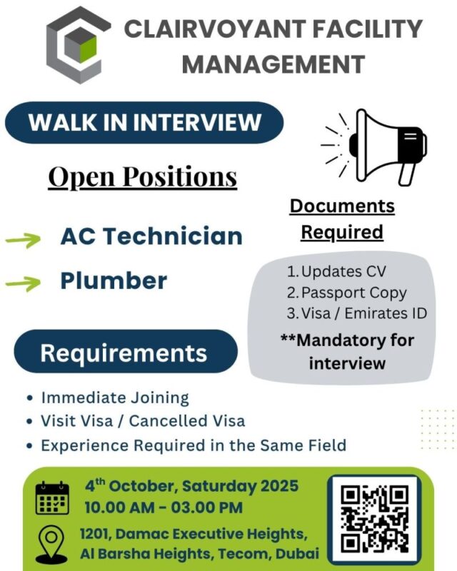 Clairvoyant Walk in Interview in Dubai provides a straightforward pathway for experienced technicians to secure employment without lengthy application procedures. Clairvoyant Facility Management is known for offering professional growth opportunities and a supportive work environment. Candidates are encouraged to arrive early to avoid queues and ensure they are considered for the available roles.