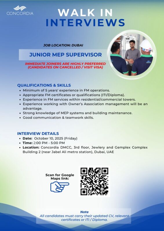 Interested candidates are encouraged to attend the Concordia Walk in Interview in Dubai. Donโt miss this chance to advance your career with a forward-thinking company. Concordia DMCC looks forward to meeting you and discussing how you can contribute to their dynamic team.