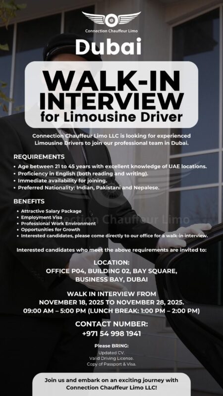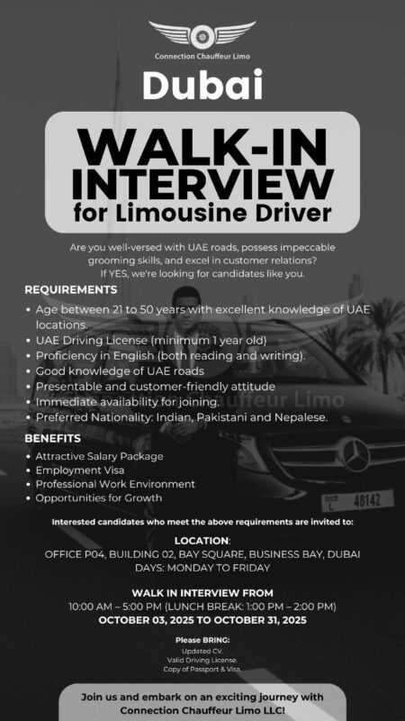 The recruitment drive is open to candidates who are well-versed with UAE roads, possess excellent grooming standards, and have strong customer service skills. Connection Chauffeur Limo is specifically looking for individuals who can deliver safe, reliable, and professional transportation experiences to its clients.