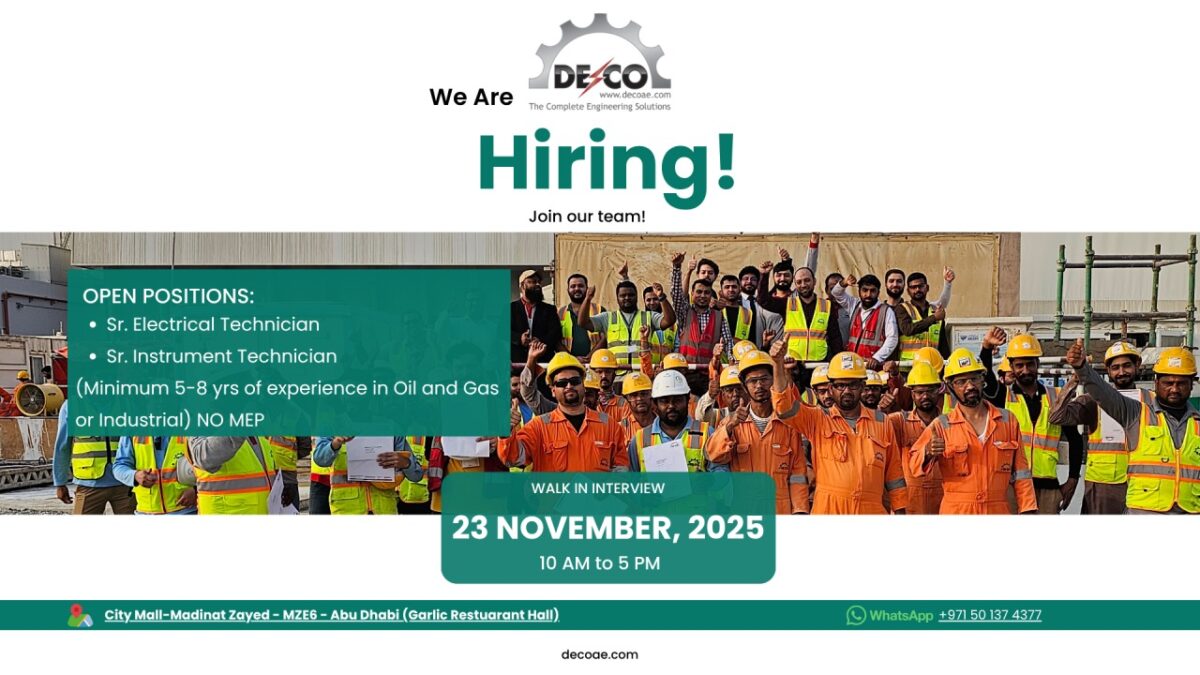 DECO Group Walk in Interview in Abu Dhabi presents a valuable opportunity for experienced electrical and instrument technicians seeking to advance their careers in Abu Dhabiβs thriving industrial sector. Candidates meeting the experience criteria are encouraged to attend the DECO Group walk-in interview and showcase their expertise to one of the leading engineering companies in the region.