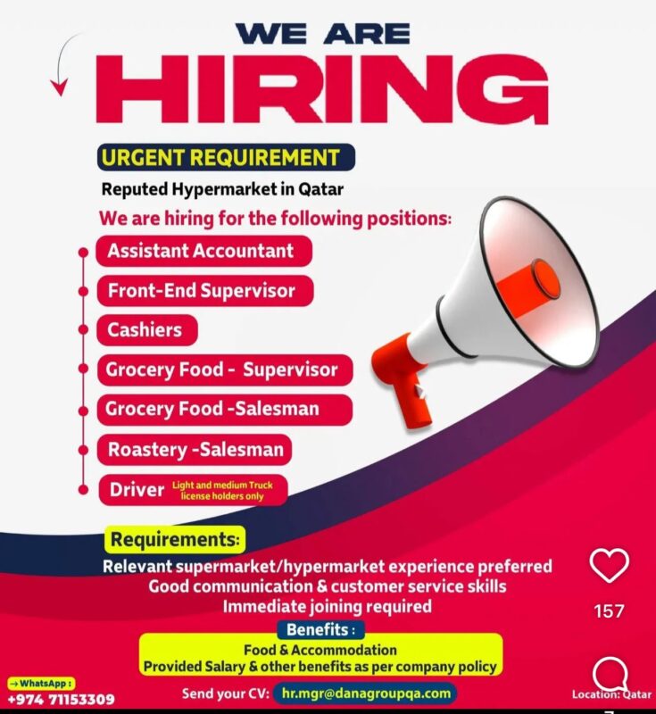 DANA Group has announced an urgent DANA Group Recruitment in Qatar for a reputed hypermarket, offering multiple job opportunities across accounting, retail operations, sales, and logistics. This hiring initiative is aimed at experienced professionals who are ready to join immediately and contribute to the smooth functioning and growth of a leading retail organization in the country 📢.