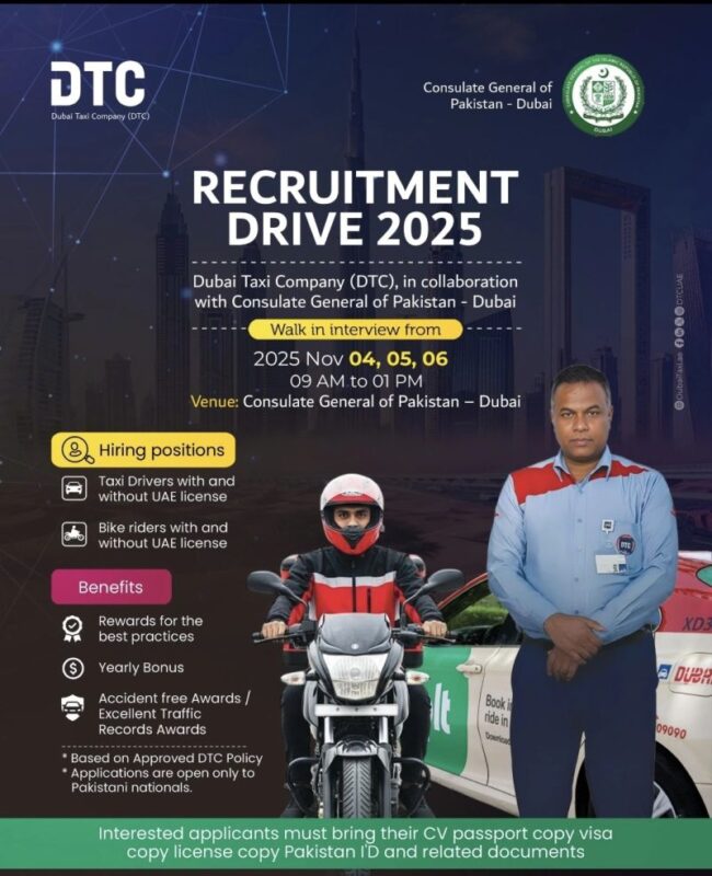 Dubai Taxi Corporation (DTC), one of the most respected transport service providers in the UAE, is conducting DTC Walk in Interview in Dubai In collaboration with Consulate General of Pakistan – Dubai. This opportunity is open to all nationalities and offers a stable career path for individuals with valid GCC or UAE driving licenses 📢.