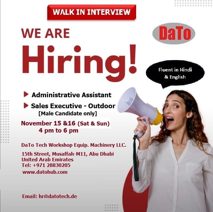 If you are seeking a rewarding career in administration or sales within the industrial sector, this DaTo Tech Walk in Interview in Abu Dhabi is an opportunity you shouldnโt miss. Prepare your CV, dress professionally, and head to Musaffah-M11 to explore your next career move with DaTo Tech.