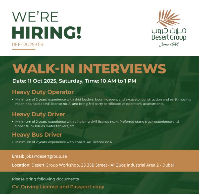 Desert Group Walk in Interview provides an excellent opportunity for experienced drivers and equipment operators to join a reputable company in Dubai. Desert Group seeks individuals who are ready to contribute to their team, upholding quality standards in every project. Interested candidates can send their CV to [email protected].