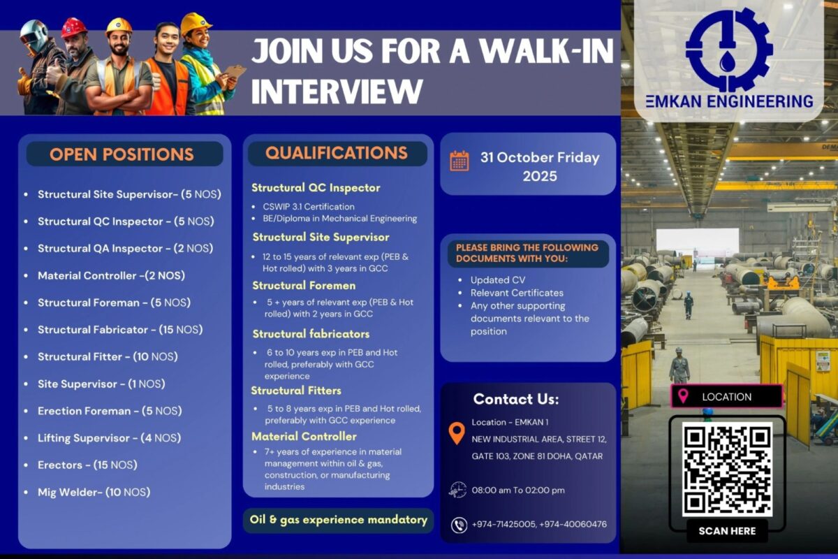 Don’t miss this opportunity to join EMKAN Engineering Walk in Interview in Qatar. Whether you’re an experienced foreman, engineer, or technician with expertise in steel structures, this is your chance to advance your career in Qatar’s thriving engineering sector.