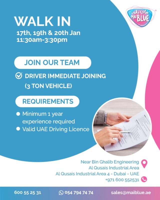 The Mai Blue Walk in Interview in Dubai represents an excellent opportunity for job seekers to secure stable and rewarding employment. With a strong reputation in the market and a commitment to employee growth, Mai Blue continues to be a preferred employer in the UAE. Interested candidates are advised to attend the interviews promptly and take the first step toward an exciting career journey with Mai Blue.