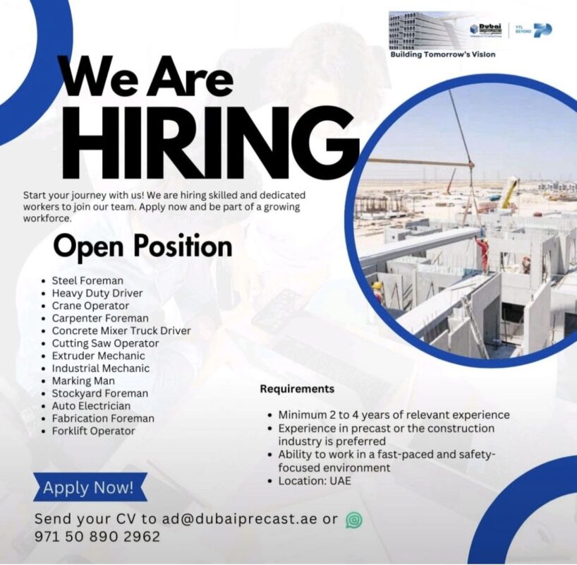 Dubai Precast Recruitments, a leading company in the construction and precast industry, is currently hiring for multiple positions. This is a great opportunity for experienced professionals seeking career growth in a dynamic and well-established organizationπ’.