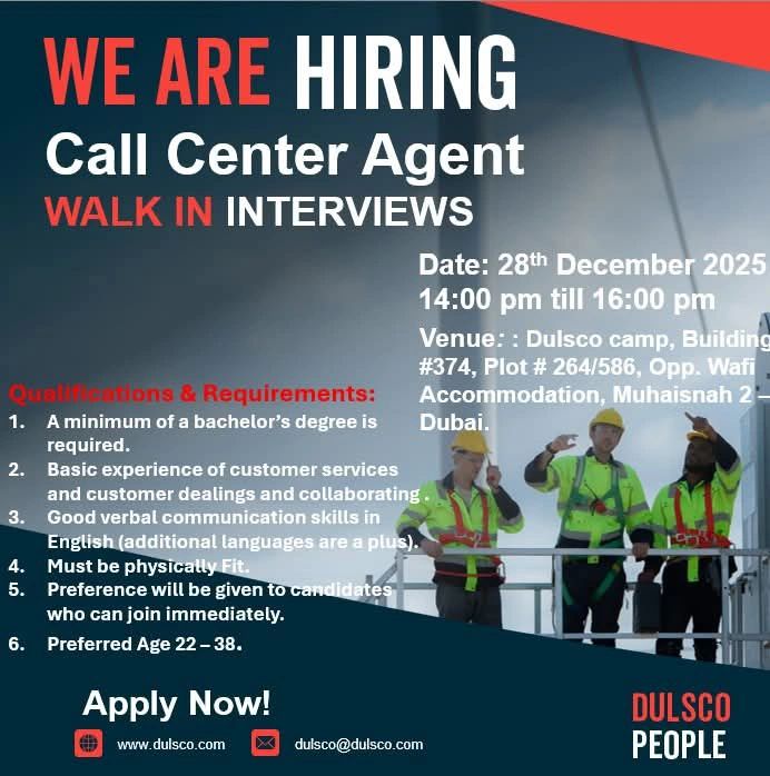 Interested candidates are invited to participate in the Dulsco Group Walk in Interview in Dubai. It is recommended to bring along a copy of their updated resume, along with relevant educational and experience certificates.