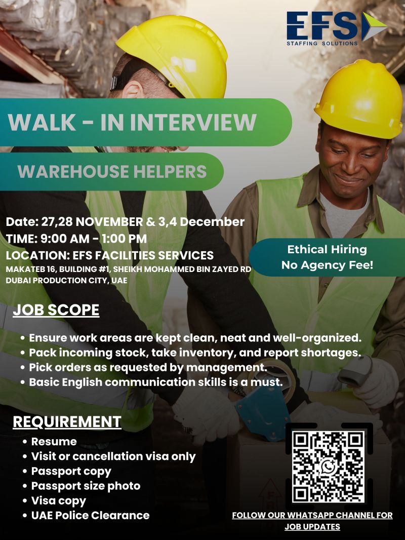 EFS Staffing Solutions Walk in Interview in Dubai offers an excellent opportunity for qualified professionals to showcase their skills and experience. This walk in interview presents a valuable opportunity for those looking to take their careers forward in Dubaiโs thriving property sector.