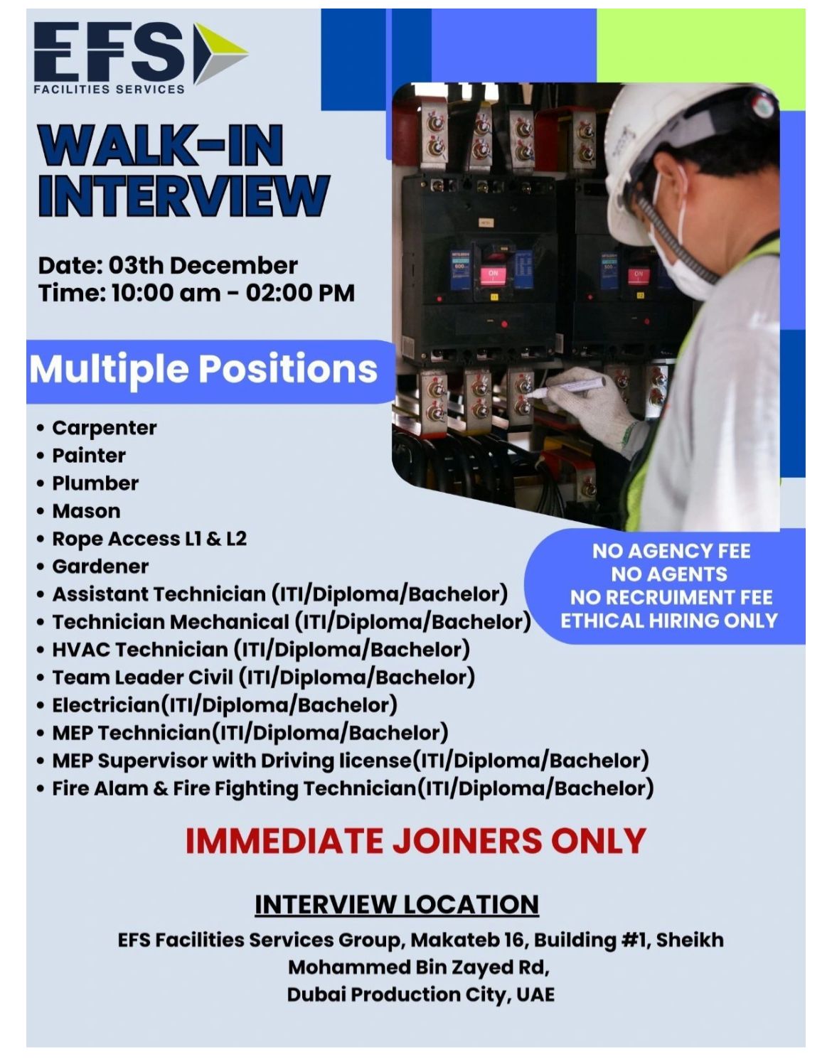 EFS Facilities Walk in Interview in Dubai provides a valuable opportunity for candidates with relevant experience to join one of the leading facilities management companies in the UAE. EFS Facilities Services is renowned for its high standards of operational excellence and ethical employment practices.