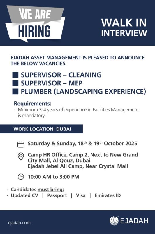 Ejadah Walk in Interview in Dubai is a great opportunity for skilled professionals in the facility management sector to join Ejadah Asset Management. Interested candidates should prepare by reviewing the job requirements and ensuring they bring all necessary documentation to the interview. For more information about the company and the roles, visit ejadah.com.