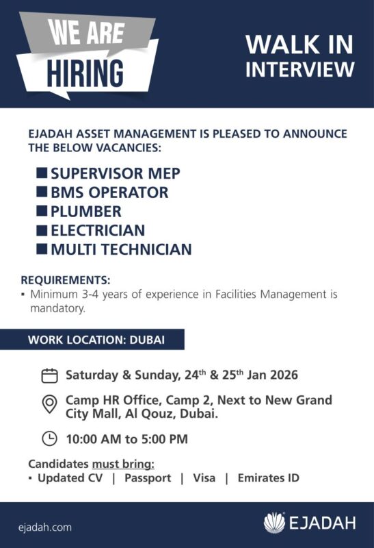 Ejadah Asset Management continues to build its reputation as a leading employer in the facilities and asset management industry. The Ejadah Walk in Interview in Dubai initiative offers a valuable opportunity for experienced technicians to join a reputable organization known for its professional working environment and growth potential.