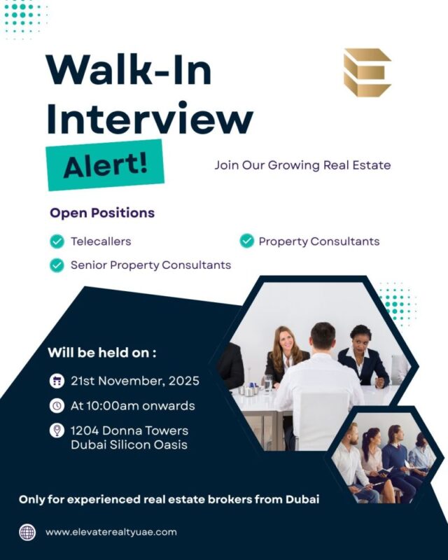 One of Dubai’s fast-growing names in the real estate brokerage sector, has announced a Elevate Realty Walk in Interview in Dubai scheduled for 21st November 2025. The firm is actively seeking experienced and motivated professionals to join its expanding team, offering a promising opportunity for individuals aiming to grow within Dubai’s competitive property market 📢.