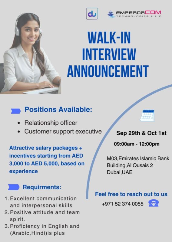 Emperorcom Technologies Walk in Interviews in Dubai is an excellent chance for aspiring professionals to join a reputable company and take their careers to the next level in Dubai’s thriving business environment. For any inquiries, candidates may reach out directly at +971 52 374 0055.