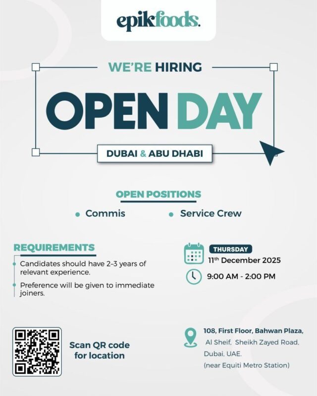 Epik Foods Open Day Recruitment in Dubai is an excellent opportunity for job seekers to connect directly with the hiring team. Attendees can gain insight into the company culture, the specific roles available, and what it takes to succeed in a fast-paced environment. With a focus on delivering high-quality food and service, Epik Foods is looking for passionate individuals who are ready to contribute to their mission.