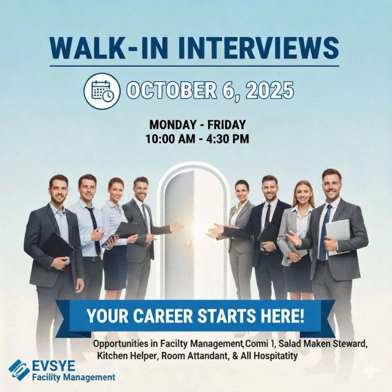 Interested candidates are encouraged to attend the EvSye Facility Walk in Interview from October 6th Onwards, 2025 (Monday to Friday), at the given location in Dubai. This is a great opportunity to secure a rewarding job in a well-established company.