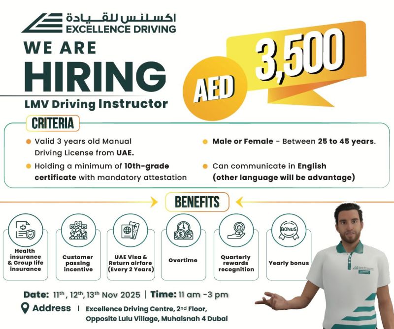 Excellence Driving has established itself as a trusted name in driver training across the UAE. With state-of-the-art facilities and a focus on quality instruction, the company offers its instructors a professional environment backed by continuous learning and recognition. This recruitment drive is not only a chance to secure a stable job but also an opportunity to be part of an organization that values dedication and growth.