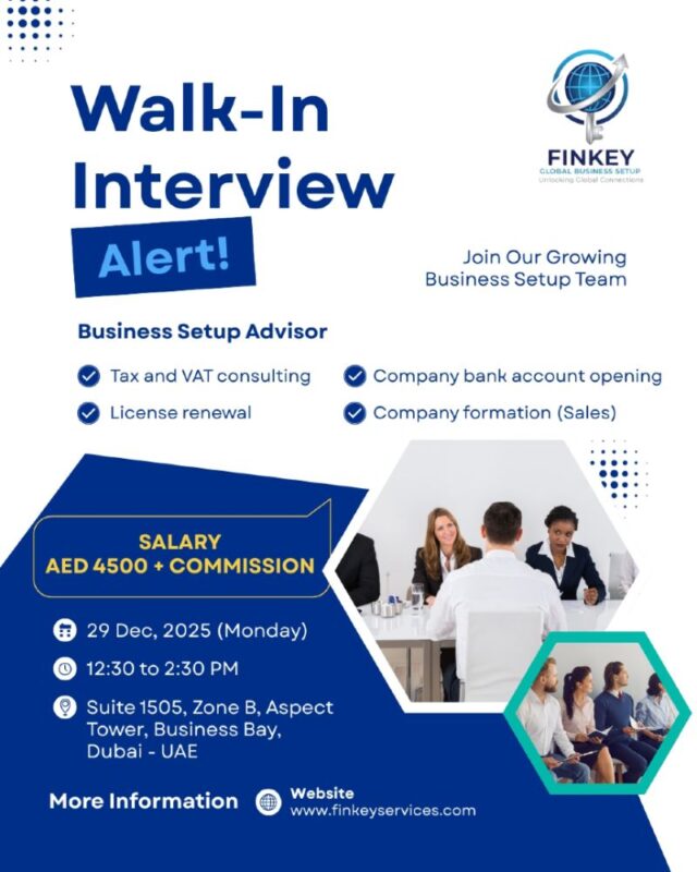 Finkey Global Business Setup has announced Finkey Global Business Setup Walk in Interview in Dubai, offering a strong opportunity for professionals seeking a career in business consultancy and company formation services. Known for supporting entrepreneurs and investors across the UAE, Finkey Global continues to expand its operations and is now inviting skilled candidates to join its growing team in Business Bay ๐ข.