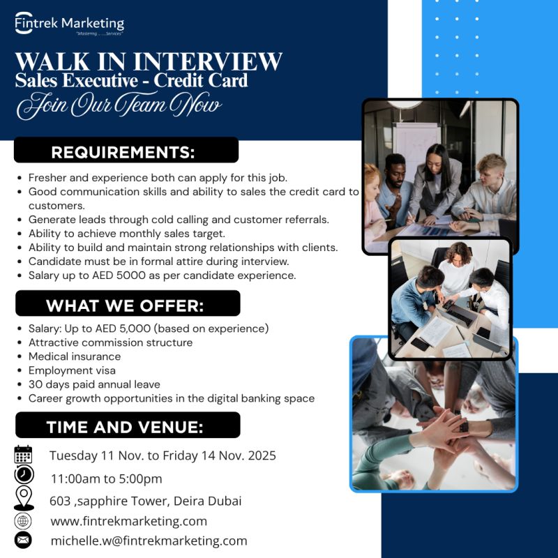 Fintrek Marketing, a dynamic and growing company in the financial services sector, is hosting a Fintrek Marketing Walk in Interview in Dubai. With a commitment to excellence and a dynamic team, Fintrek Marketing offers an exciting work environment where employees can thrive and grow professionally ๐ข.