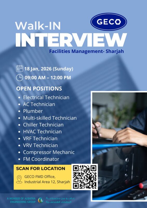 A trusted name in facility management services and a proud member of the Albatha Engineering Group, is conducting a GECO Walk in Interview in Sharjah. This is a golden opportunity for skilled professionals to join one of the regionโs most respected organizations in the field of engineering and facility management ๐ข.